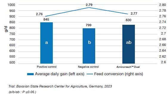 - Aminoreach™ Dual results in an improvement of +3,9 % ADG vs Negative Control.