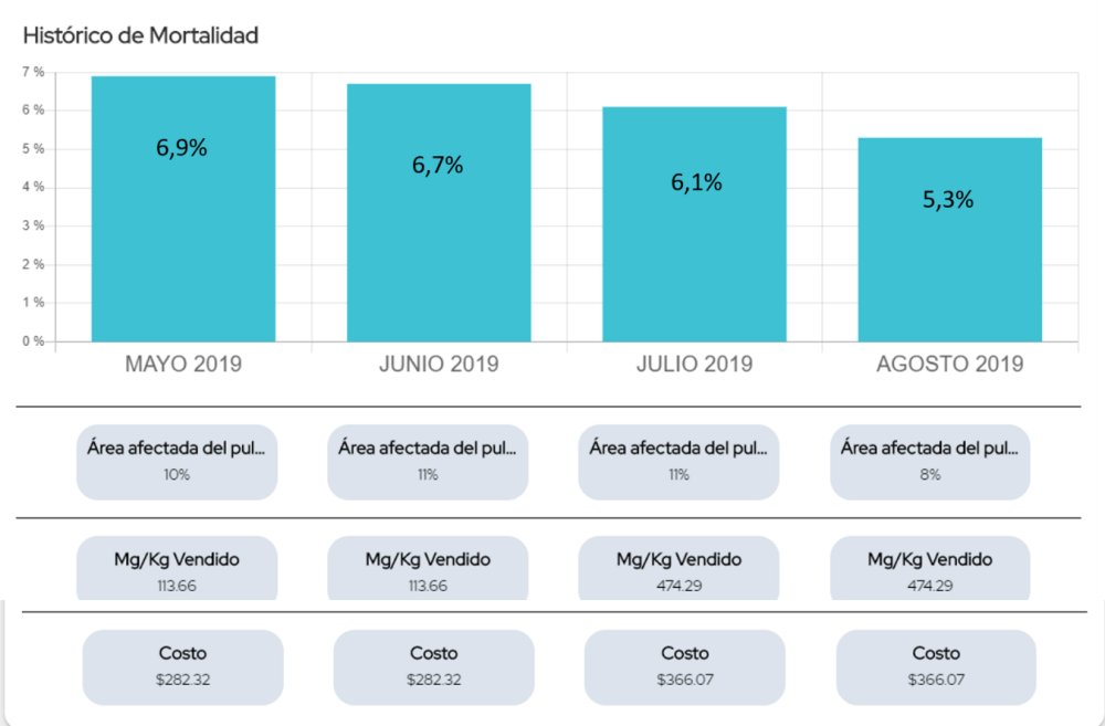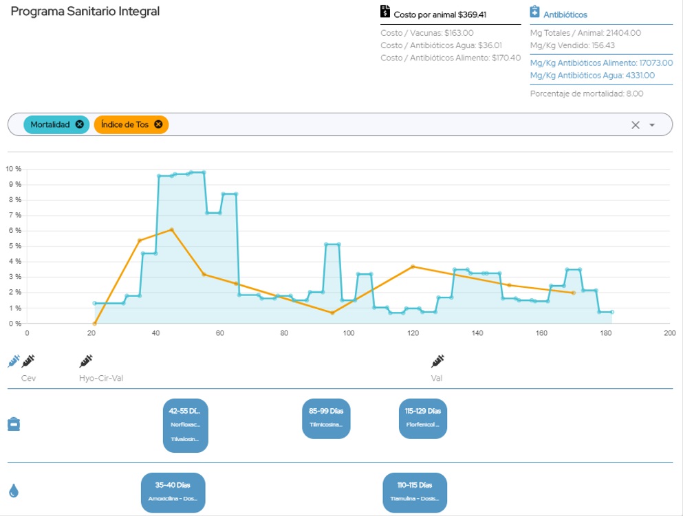 Además de esto, en este gráfico se podrá observar el costo por animal que tiene el programa sanitario, y también podremos ver el nivel de uso de antibióticos, ya que visualizaremos los miligramos de principio activo utilizados por animal y por kilogramo vendido. Y en la sección de histórico de mortalidad se podrán observar como evolucionan estas variables con el transcurso del tiempo.