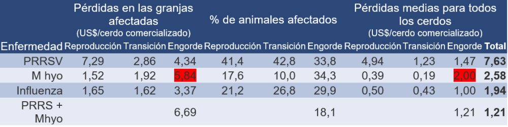 Como se puede observar en el cuadro a continuación realizado por Derald Holtkamp Mycoplasma Hyopneumoniae es el agente que mayor impacto económico tiene en los engordes: