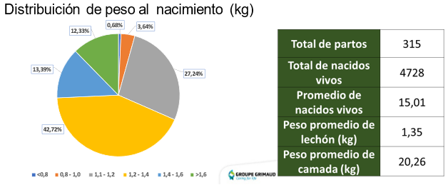 El trabajo continuo y sostenido de los objetivos de mejora genética han producido un hembra de excepcional capacidad materna, nuestra CG36 (producto del cruce de la CGM3 y CGM6) tiene la capacidad de producir camadas con peso promedio individual del lechón de 1.35 kg en promedio, con sólo 4% de los lechones nacidos con peso menor a 1 kg. Esto tiene un impacto enorme en la reducción de la mortalidad predestete.