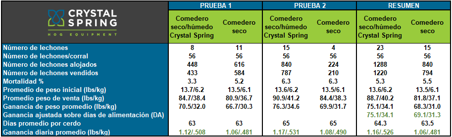 Estos resultados muestran cómo el comedero de recría/destete Crystal Spring proporcionó a los lechones un mejor comienzo, en concreto, su aumento general de ganancia, ajustado por los días de alimentación. Los lechones que se alimentaron en nuestros comederos ganaron un impresionante 2,8 kg adicionales (una mejora de 0,045 kg. de Ganancia Promedio Diaria.)