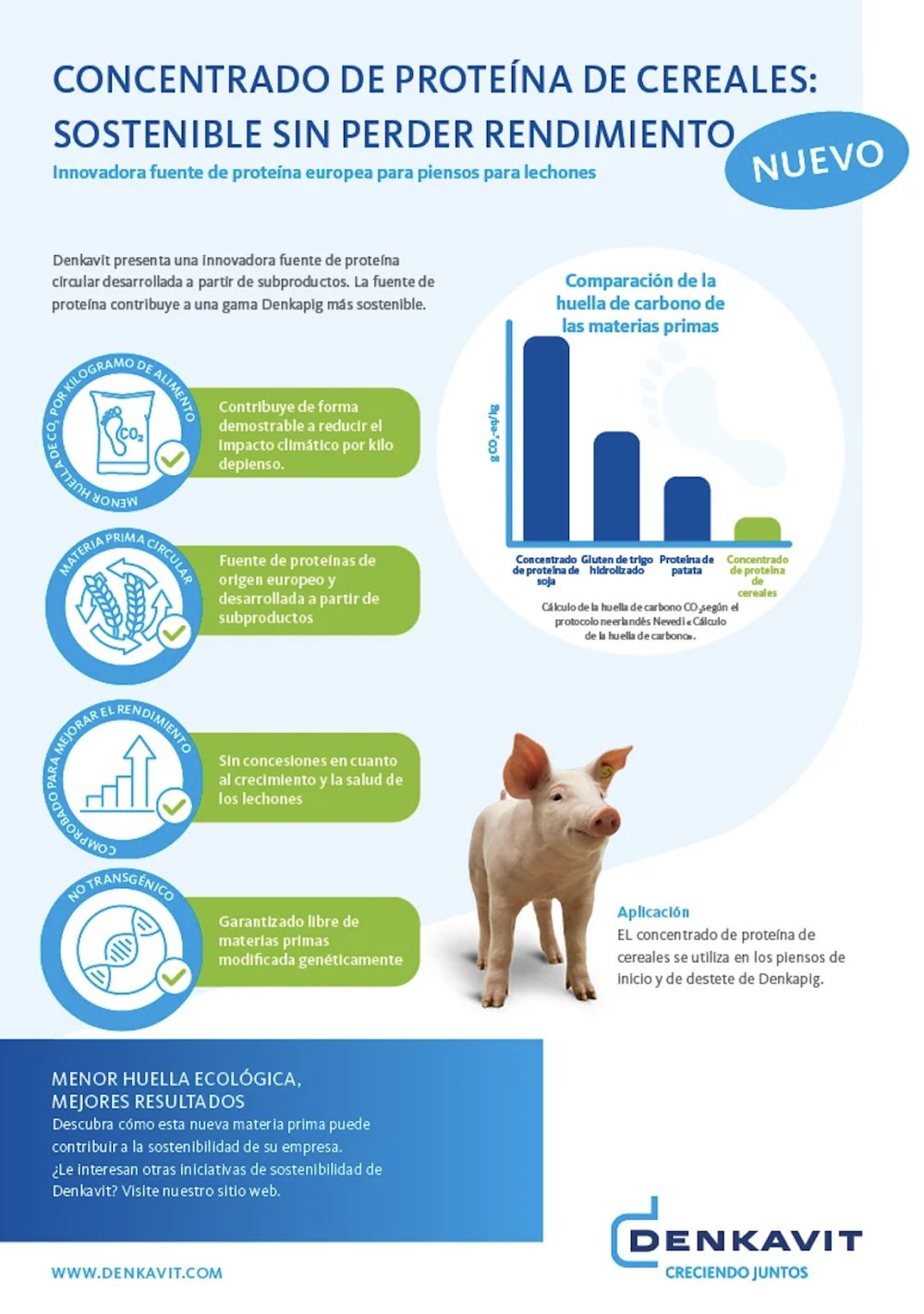 Esta nueva materia prima, el concentrado de proteína de cereales, ha sido sometida a exhaustivas pruebas en el Denkafarm Innovation Centre, la granja porcina. Las investigaciones demuestran que el concentrado de proteína de cereales no solo mantiene el crecimiento y la salud de los lechones, sino que también contribuye de manera significativa a la sostenibilidad*. El uso de esta materia prima reduce la huella de carbono de los piensos para lechones (CFP) gracias a la sustitución de parte de la soja.