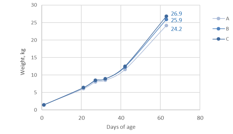 La investigación demuestra que la ingesta de alimento en los primeros cuatro días después del destete fue significativamente menor para los lechones que no recibieron lactoiniciador en comparación con los dos grupos que sí recibieron lactoiniciador. Los lechones que si recibieron lactoiniciador continuaron mostrando un crecimiento significativamente mayor después del destete y un mayor peso al fin del periodo de destete. En la figura 1, pueden verse los resultados de la prueba hasta el día 63 de vida del lechón, el grupo A fue el grupo que no recibió el prestarter, mientras que el grupo B (Top Wean) y el grupo C (Mellow Go) si recibieron lactoiniciador.