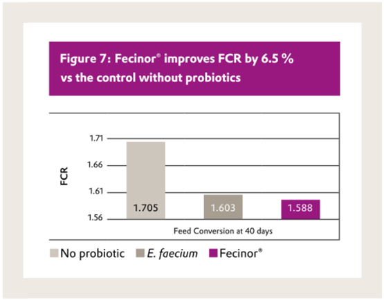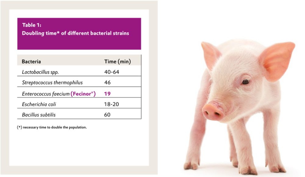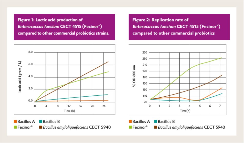 Enterococcus faecium CECT 4515 (Fecinor®) has a higher growth rate when compared to other probiotics and produces high amounts of lactic acid, being able to reduce the levels of pathogenic bacteria in the gut and maintain a balanced microbial population. Because of its extra layer of polysaccha[1]rides in its structure, Fecinor® activity starts already in the duodenum.
