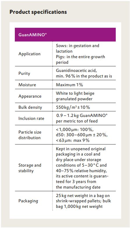 GuanAMINO® GuanAMINO® is the best creatine source due to its outstanding stability in processing and high bioavail - ability to the animal. GuanAMINO® is a preparation of GAA granulated with starch, to match the handling needs of the feed industry. It is virtually dust free, free flowing and has perfect handling characteristics.