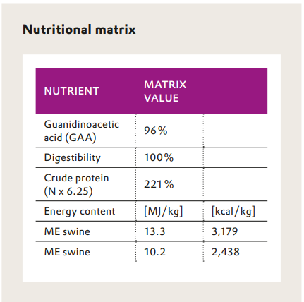 Creatine is a constituent of central importance in energy metabolism, particularly of muscle cells. Therefore, more than 90% of the body’s creatine pool is located in muscle tissues. In the body, creatine is formed by de novo synthesis through methylation of guanidinoacetic acid, which itself is formed from the amino acids glycine and arginine. The animal’s demand for creatine can partly be ful - filled directly from animal byproducts which have limited amounts of creatine. It is estimated that around two-thirds of the daily need for creatine is covered by the body’s own synthesis, while the rest must be supplied through the feed. Especially in modern fast-growing animals, the creatine demand cannot be fully met by the de novo synthesis. Supple - mentation of GuanAMINO® in the feed compensates the gap in creatine.