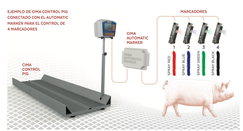 - CIMA Automatic Marker: Es una herramienta de cima control pig para marcar cerdos con spray de color y poder seleccionarlos en carga según la gama de peso ideal para obtener la máxima paga del frigorífico.
