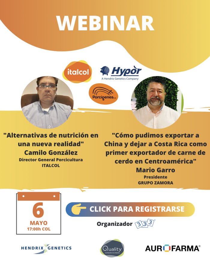 Italcol e Hypor te invitan a un evento online en el compartirán alternativas de nutrición en una nueva realidad con el Sr. Camilo Gonzalez y por otra parte, hemos invitado al Sr. Mario Garro, primer productor porcino que transformó a Costa Rica en exportador de carne de cerdo en Centroamérica. Con él aprenderemos cuáles fueron sus desafíos, aprendizajes y enseñanzas para ser un exportador de carne a China.