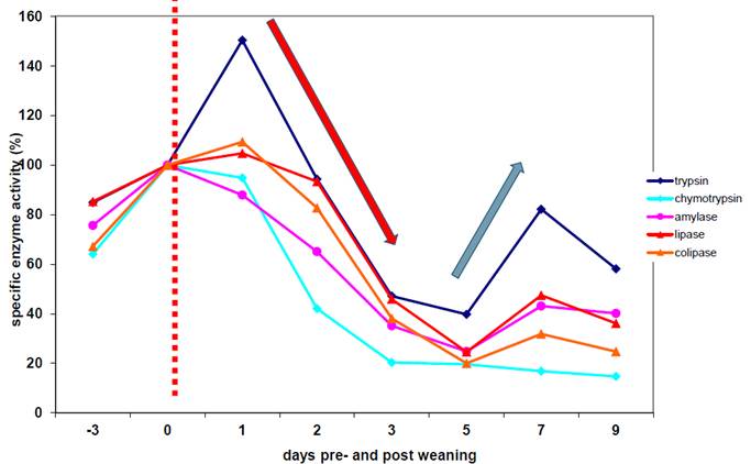 - Cantidad de proteasas endógenas producidas naturalmente en el tracto intestinal: Influenciada por factores externos como la salud y la edad del cerdo. Por ejemplo, los cerdos con problemas de salud pueden tener una producción reducida de enzimas, lo que disminuye la eficiencia de digestión proteica. En lechones tras el destete, la actividad de las enzimas digestivas generalmente disminuye, lo que afecta significativamente la capacidad del animal para digerir y absorber nutrientes de manera eficaz (Fig 1). Las enzimas clave afectadas incluyen tripsina, quimotripsina y amilasa. Esta última, aunque principalmente involucrada en la digestión de carbohidratos, cuando reduce su actividad tras el destete puede impactar la eficiencia digestiva global⁵.