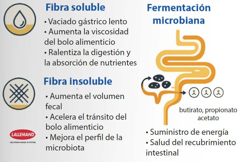 La fibra dietética influye significativamente en el rendimiento de los cerdos, ya que afecta al bienestar, la velocidad de la digestión y la expresión del potencial genético. La microbiota desempeña una función fundamental en la valorización de la fibra a través de complejos procesos metabólicos cruzados. Bacterias celulolíticas específicas utilizan enzimas para descomponer la compleja estructura de los carbohidratos de la fibra y producir ácidos grasos de cadena corta (AGCC), acetato, propionato y butirato, que sirven