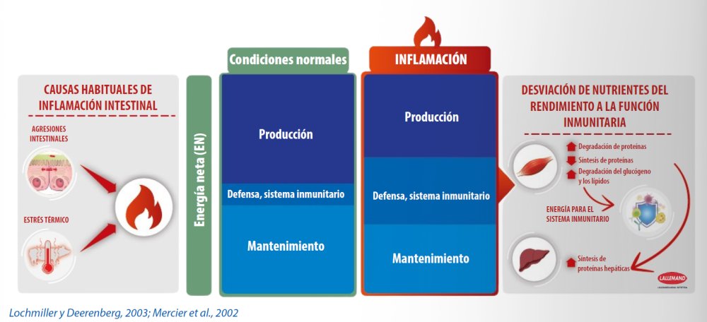 En condiciones saludables, la energía procedente del alimento se destina al mantenimiento, el crecimiento y la producción de leche. Durante la inflamación, la energía se desvía de las funciones productivas, lo que compromete el crecimiento, la reproducción y la eficiencia de la conversión alimentaria.