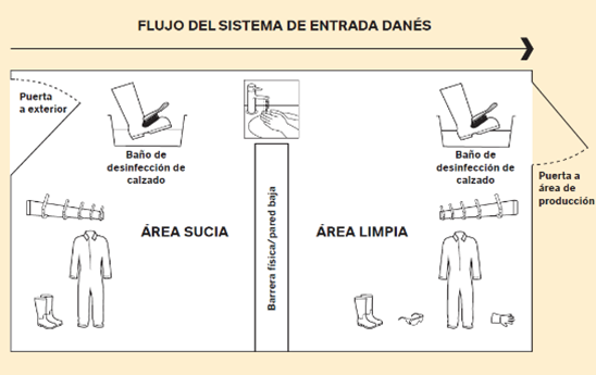 Uno de los aspectos más importantes de la bioseguridad es comprender y emplear líneas de separación entre las áreas limpias y las sucias. Esto debe implementarse en todo el sistema de producción, por ejemplo, entre la manga de carga y el transporte porcino, entre la parte sucia y la limpia del sistema de entrada danés, o entre el suelo y la cabina de un vehículo de entrega. Deben identificarse todas las líneas de separación pertinentes y establecerse y aplicarse procedimientos correctos para lograr esta separación. El principio básico del sistema danés debe emplearse en diferentes áreas, como por ejemplo: duchas, entrada y salida de corrales, movimiento de animales, etc.