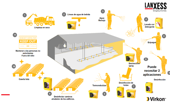 En este proceso es indispensable usar los fundamentos de la limpieza y desinfección como son, limpieza en seco, lavado con detergente alcalino, secado y desinfección. El uso de productos con eficacia probada contra el virus de PPA es indispensable. BiosolveTM, Virkon™ S y Virkon™ LSP son productos que deben incluirse en los programas de limpieza y desinfección para mejorar el perfil de sanidad de la granja gracias a la bioseguridad avanzada.