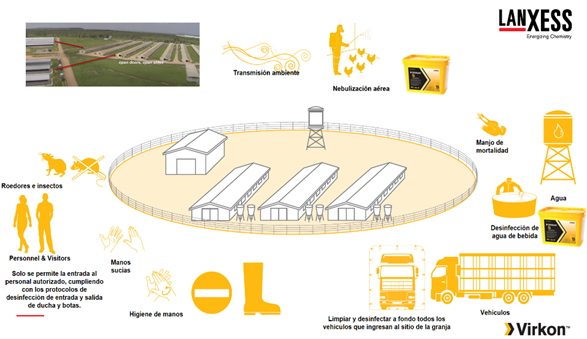 Durante la planificación, es vital considerar los vehículos como puntos críticos para la diseminación de la enfermedad. Por los que los programas de limpieza y desinfección de vehículos y el uso adecuados de arcos de desinfección y rodiluvios deben ser implementados de manera de correcta y con los productos adecuados para cada proceso.