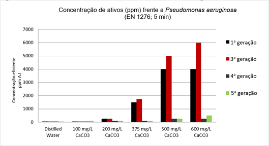 Em outro estudo, o quaternário de 5ª geração do TH4+® obteve melhor desempenho conforme o aumento da dureza da água, demonstrando excelente atividade bactericida mesmo quando diluído em água dura.
