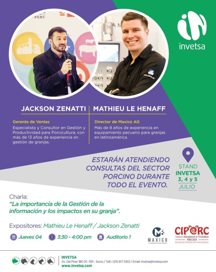 MAXICO AG / MAXIMUS estará presente en el Congreso CIPORC 2019 en Perú. El equipo de especialistas atenderá consultas de gestión y hacer diagnósticos de productividad para las granjas del país, además daremos la conferencia "La importancia de la gestión de la información y los impactos en su granja". Los esperamos!