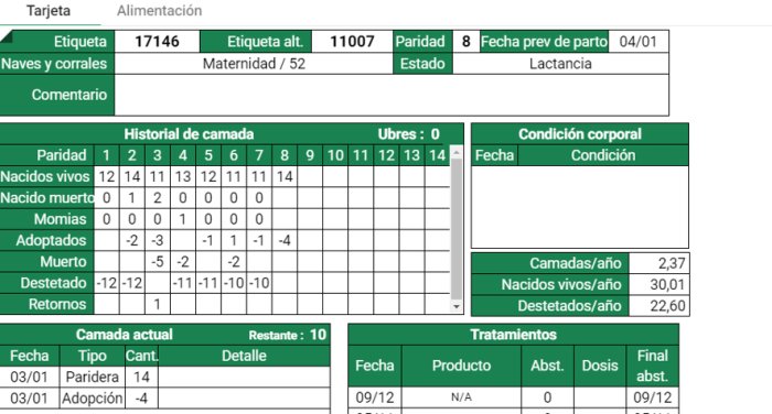Guarda los datos de las cerdas hasta el final de la vida del animal.