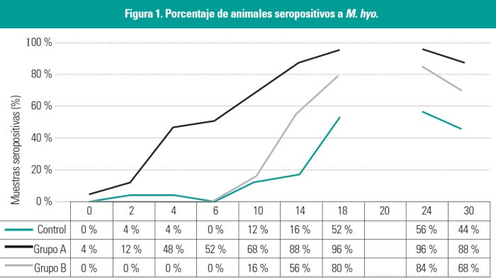 En el grupo A, el 48 % de los animales eran seropositivos a M hyo en la semana 4, aumentando a 96 % en la semana 18 del estudio y permaneciendo cerca del 90 % hasta el último muestreo. El porcentaje de animales positivos en el grupo control y B permanecieron bajos hasta la semana 6 y luego aumentaron en la semana 18 hasta el 52 y el 80 %, respectivamente (figura 1).