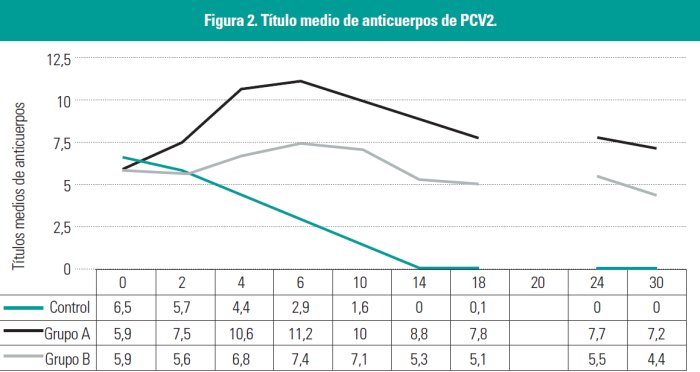El título medio de anticuerpos contra PCV2 en la vacunación fue de aproximadamente 6,2. El título en el grupo de control se redujo a cero en la semana 14. En el grupo B, los títulos aumentaron ligeramente a 7,4 en la semana 6 y luego declinó a 4,4 en la semana 30. El grupo vacunado con Porcilis PCV M Hyo mostró un aumento positivo hasta 11,2 después de la vacunación y seguía teniendo un título medio de 7,2 en la semana 18 del estudio (figura 2).