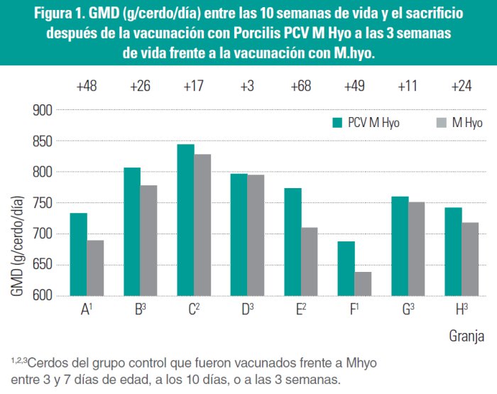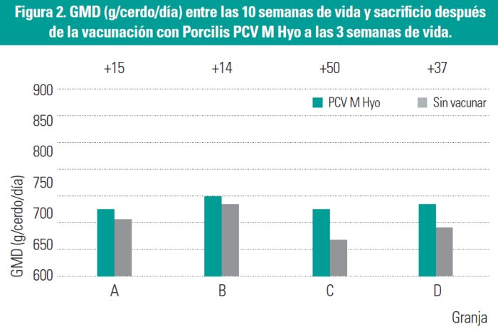 Se comparó la vacunación con Porcilis PCV M Hyo en lechones de 3 semanas de vida frente a otros programas vacunales (control) en 15 granjas belgas. El grupo control varió entre granjas: vacunación única frente a Mhyo (A, n = 8) vacunación única frente a PCV2 (B, n = 1), inyecciones separadas frente a Mhyo y PCV2 (C, n = 2) o ninguna vacunación (D, n = 4).