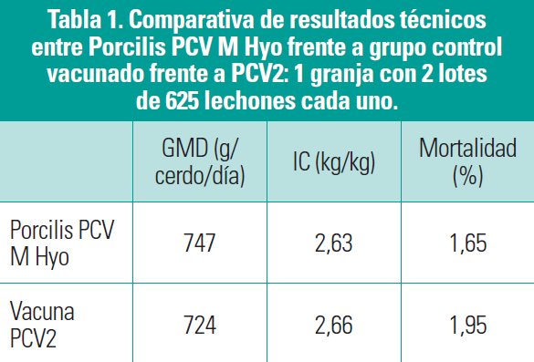 ■■ La tabla 1 resume los resultados técnicos de la granja en la que se vacunaron los cerdos del grupo control solamente frente a PCV2 a los 24 días de edad. Después de la vacunación con Porcilis PCV M Hyo mejoraron GMD, IC y