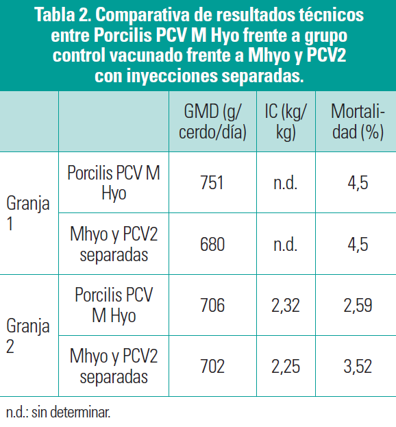 ■■ En comparación con dos vacunas aplicadas mediante inyecciones separadas, la vacunación con Porcilis PCV M Hyo mejoró la GMD en una de las granjas y la tasa de mortalidad en la otra. Los parámetros técnicos medios fueron similares, tal y como se muestra en la tabla 2.