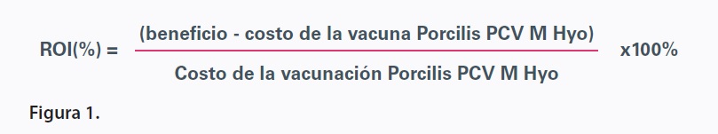 Se realizó un estudio de campo (2) para comparar el efecto de la vacunación combinada contra PCV2 y M. hyo a las tres semanas de edad frente a la vacunación contra M. hyo solamente. Los cerdos durante la finalización se alojaron en unidades de engorde separadas, pero en el mismo lugar. El aumento de peso promedio diario (GMD) se calculó dividiendo el aumento de peso promedio entre el número de días en la unidad de engorde. La tasa de conversión de alimentación (CA) fue monitoreada cuando fue posible. Al finalizar el estudio, el retorno de la inversión (ROI) (%) se calculó según la fórmula que se muestra en la Fig. 1. El beneficio de la vacunación con Porcilis PCV M Hyo se calculó de este modo en base a € 0,025 por + 1 g/cerdo/día en GMD y € 0,23 por -0,01 en CA.