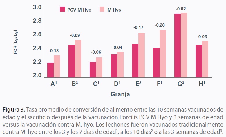 En las ocho granjas participantes, los lechones fueron vacunados tradicionalmente contra M. hyo ya sea entre los tres y siete días de edad (5/8), a los 10 días (1/8) o a las tres semanas de edad (2/8). Las mejoras en GMD y CA por granja se ilustran en las Figs. 2 y 3. En comparación con la vacunación contra M. hyo solamente, el aumento promedio después de la vacunación combinada con PCV y M. hyo fue de GMD + 27g/cerdo/día, CA - 0.09, Porcentaje de cerdos sin lesiones pulmonares similares a M. hyo en el momento del sacrificio + 29% y la tasa de mortalidad fue similar en ambos grupos (2,2% y 2,1%).