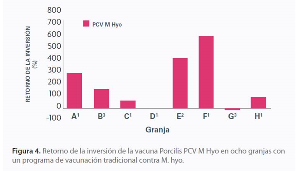 Basado en GMD y CA, el retorno de la inversión promedio (ROI) (%) de Porcilis PCV M Hyo fue: [(2.73-1) / 1] x 100% = 173%. El retorno de la inversión (%) por granja se ilustra en la Fig. 4.