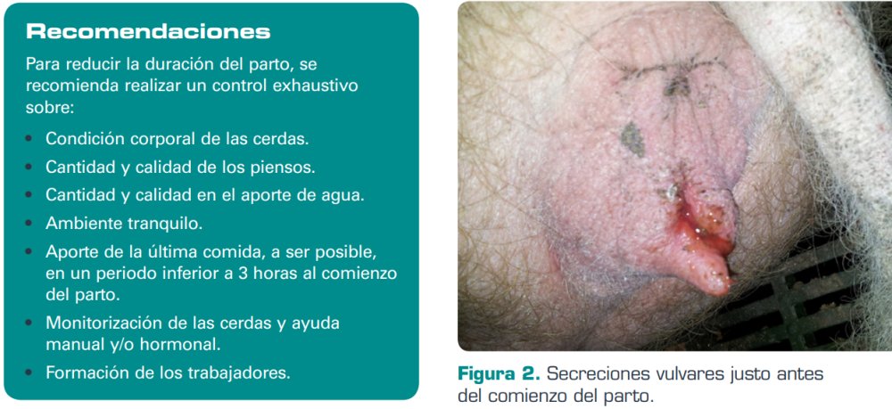 Estas hormonas son las responsables de que unos días antes del parto (2-3 semanas) se inicie un desarrollo evidente de las glándulas mamarias y un mayor tamaño vulvar. Además, unas horas antes del parto se observa nerviosismo en las cerdas, secreciones vulva- res (figura 2), eyección de calostro, incremento de la temperatura corporal de la cerda, etc.