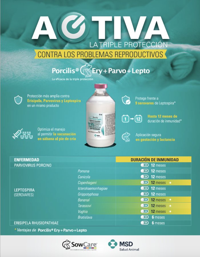 Porcilis Ery+Parvo+Lepto® es la única vacuna reproductiva en porcinos que ofrece hasta 12 meses de inmunidad y protección comprobada para cerdas nulíparas y multíparas, además de la más amplia protección contra la leptospirosis entre las cuales se encuentran nueve (9) serovares adaptadas y no adaptadas: Pomona, Bratislava, Tarassovi, Vughia, Canicola, Copenhageni, Icterohaemorrhagiae, Grippotyphosa, Bananal.