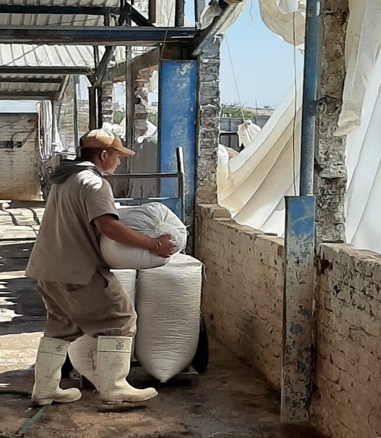 La distribución en la granja, que es realmente el Proceso de alimentación puede hacerse en costales cargados a mano, transportado con carretillas o carritos, o utilizando sistemas de conducción con gusanos helicoidales o cadenas, desde el silo, hasta las bocas de cada comedero.