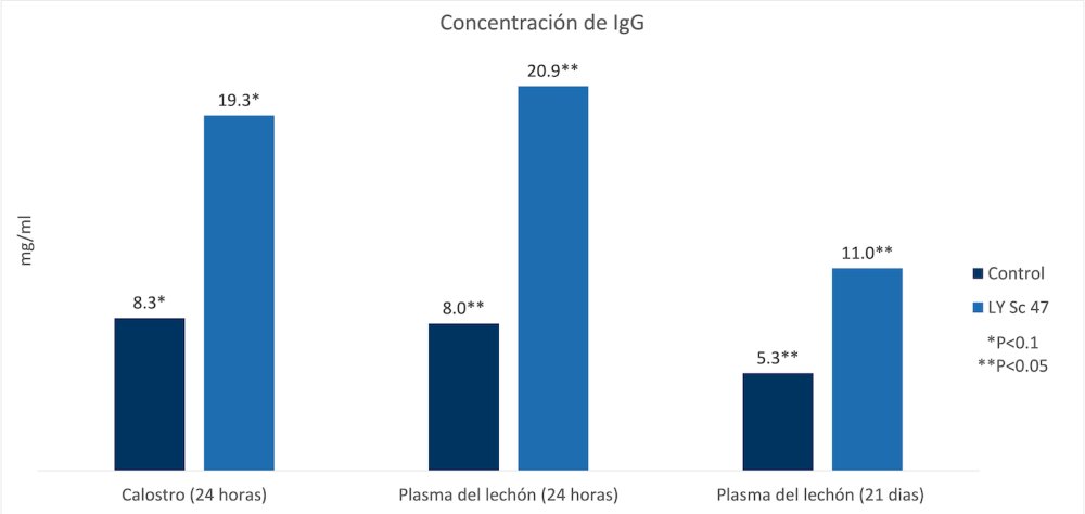 Figura 1. La suplementación con levadura viva (LV) Sc47 a las cerdas mejora la transferencia inmunitaria a los lechones (Jang et al., 2013)