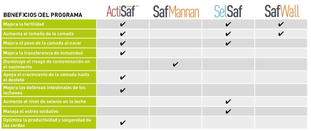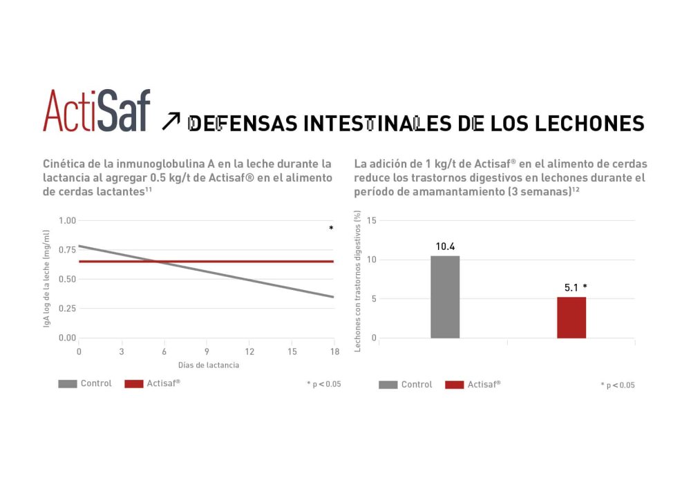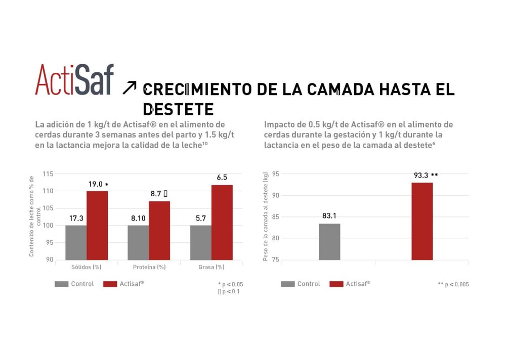 Un estudio demostró los efectos benéficos en el crecimiento fetal al suplementar Actisaf® durante el final de la gestación, lo que llevó a un mejor crecimiento desde el nacimiento hasta el destete. La adición de Actisaf® en el alimento de las cerdas mejoró significativamente la composición de la leche (proteína, grasa y materia seca). Al modular las propiedades nutricionales de la leche, Actisaf® ayuda a mejorar el crecimiento de los lechones lactantes durante esa etapa. Una mejor composición nutricional de la leche y un mayor contenido de materia seca induce a un mejor peso al destete. Por ende, la adición de Actisaf® en el alimento de las cerdas mejora el desempeño de lechones lactantes y pone en una posición más favorable a los lechones destetados para que crezcan en el futuro.