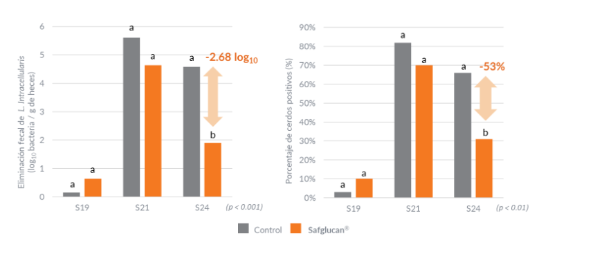 Phileo ha demostrado que la suplementación de la dieta con Safglucan en cerdos mejora significativamente el crecimiento y reduce el porcentaje de cerdos de crecimiento lento. Además, también se ha observado un cambio favorable en el microbioma en los cerdos suplementados. La resiliencia intestinal mejoró significativamente, como lo demuestra una reducción en la excreción promedio de L. intracellularis y/o la disminución de la prevalencia de cerdos que expulsan un alto número de esta bacteria.