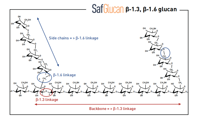 - Safglucan® tiene una estructura específica con un enlace β-1.6 por cada 8/10 de D-Glucosa seleccionada (por laboratorio Método Hakomori) para estimular la inmunidad.