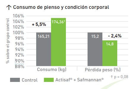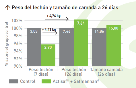 La suplementación de la dieta de las cerdas con Actisaf® + Safmannan® durante la lactación, preservó su condición corporal y el consumo de pienso. Además, en comparación con el grupo Control, los lechones con Actisaf® + Safmannan® mostraron mejor crecimiento y mayor tamaño de camada al destete. Comparado con el grupo Control, la adición de Actisaf® + Safmannan® en dietas de lechones destetados logró el mismo rendimiento, a un coste menor.