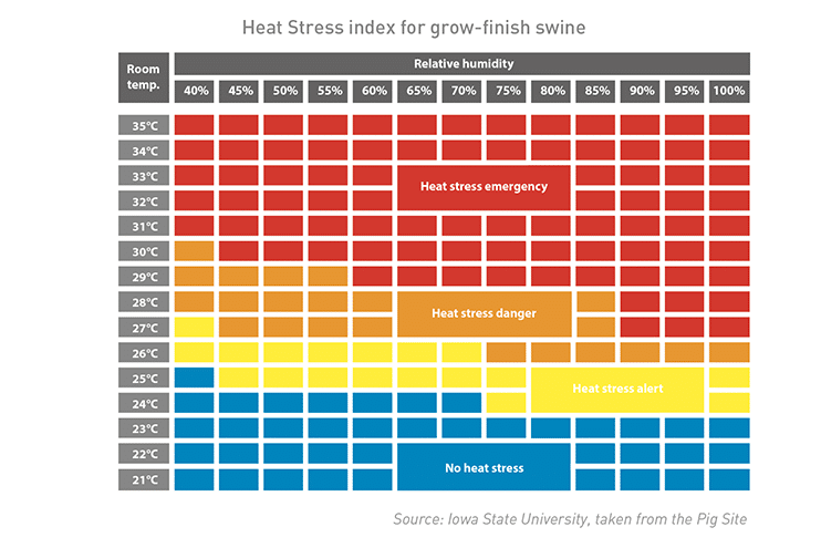 Comenzando con el problema central, el estrés por calor en los cerdos comienza a convertirse en motivo de preocupación cuando las temperaturas suben por encima de los 24 ° C, lo que potencialmente avanza hacia un nivel de emergencia al alcanzar los 27 ° C. El factor clave a tener en cuenta es la combinación de altas temperaturas y humedad (THI). Como se muestra en el índice de estrés por calor, la combinación de una temperatura de 27 ° C y un 90% de humedad relativa (HR) es tan peligrosa para el ganado como 31 ° C y 40% de HR.