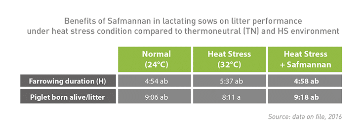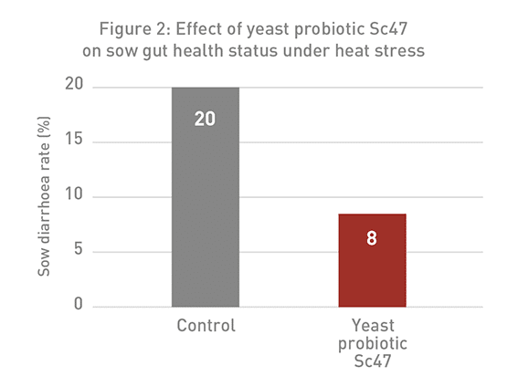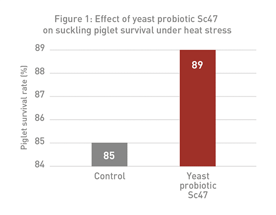 Evidencia de los pruebas comerciales posteriores, llevados a cabo en condiciones de estrés por calor (HS), indican¡ que complementar las dietas de los cerdos en engorde con un probiótico de levadura conduce a una mayor ingesta de alimento, un mejor crecimiento diario y una mejor eficiencia alimenticia (TZIKA et al., 2015; Kiros et al., 2015; LIzardo et al., 2008). De manera similar, la suplementación en el alimento de las cerdas reproductoras dio como resultado un aumento en el número de lechones destetados, mayores tasas de supervivencia y un aumento en el peso total al destete por camada.