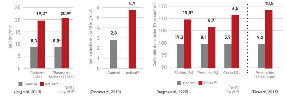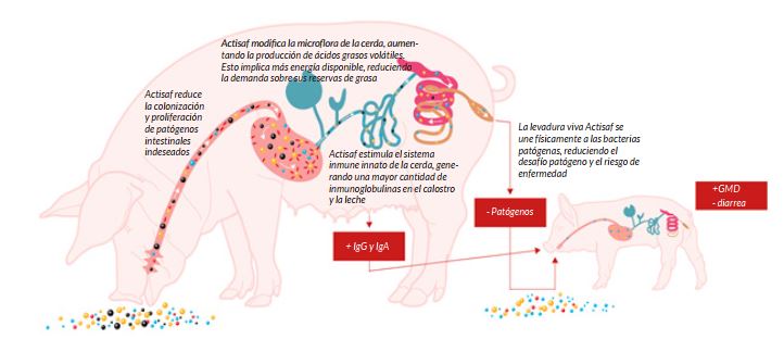 La suplementación de las cerdas con el probiótico de levadura Actisaf® durante la gestación y la lactación tiene un efecto positivo sobre la microbiota de los lechones, reduciendo la presencia de las bacterias patógenas E. coli y Clostridium en su intestino. Es crucial reducir este tipo de bacterias, ya que causan la mayoría de los problemas entéricos en lechones. Actisaf® también aumenta la calidad inmune del calostro (aumentando los niveles de IgG e IgA al suplementarlo antes del parto). También eleva la digestibilidad de la fibra, lo que aumentará la producción láctea. Suplementando Actisaf directamente a los lechones, seguiremos teniendo un efecto positivo sobre la microbiota y se reducirá el riesgo de inflamación. La levadura postbiótica Safmannan® ayuda a fortalecer las uniones estrechas y la barrera mucosa del intestino del lechón. También prepara el sistema inmune de los animales jóvenes, así sus células inmunes pueden actuar antes y más rápido ante un desafío. Cuando se detectan ciertos patógenos (E. coli, Salmonella, Clostridia), puede ser una buena idea añadir Safmannan® para potenciar el efecto de unión a patógenos de Actisaf®.