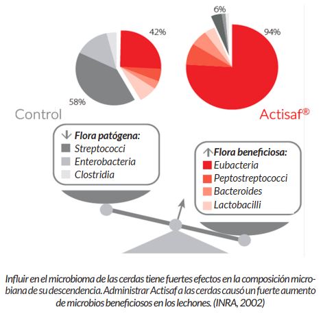antibióticos ni niveles altos de ZnO. Un intestino sano (microbioma sano y estable, entre otros) previene la proliferación de bacterias patógenas, la inflamación de la pared epitelial y de las enfermedades entéricas. Los lechones heredan la salud intestinal de sus madres. Los estudios han demostrado que el microbioma de la cerda deja una huella en el lechón, en cuanto a patógenos presentes, pero también en microorganismos beneficiosos (¡qué es lo que queremos!). En resumen,