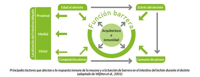 El destete es un periodo estresante para los lechones. Algunos de los factores de estrés asociados al destete son la separación de la cerda y el traslado a un alojamiento desconocido, donde los lechones necesitan buscar el pienso y el agua. Además, la mezcla de lechones de distintas camadas genera un estrés social y una fuente potencial de infección. Al mismo tiempo, debido al cambio de dieta, la ingesta tiende a ser baja en el periodo inmediatamente posterior al destete. Todos estos factores tienen efectos fisiológicos negativos. El pH del estómago sube, aumentando la susceptibilidad a infecciones intestinales. La combinación de anorexia postdestete y el cambio de dieta daña las vellosidades intestinales. Esto, a su vez, reduce la capacidad del lechón recién destetado para digerir y absorber nutrientes. El mismo efecto se produce por la inflamación del intestino, que puede provocar diarrea.