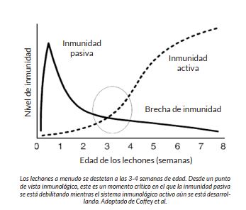 expuesto a nuevas infecciones tras el destete, por el cambio de alojamiento y la mezcla con otros lechones. El destete se suele hacer a las 4 semanas de vida, cuando la inmunidad pasiva, obtenida de los anticuerpos del calostro, ya declina. Al mismo tiempo, la inmunidad activa todavía no se ha desarrollado completamente. Tras el destete, los lechones empiezan a construir su propia inmunidad activa, que se desarrolla cuando la propia inmunidad del lechón debe responder ante las infecciones. Con la inmunidad pasiva en declive y la activa en formación, alrededor del destete los lechones están en una brecha de inmunidad, lo que implica que, si se ven expuestos a infecciones bacterianas o víricas en el