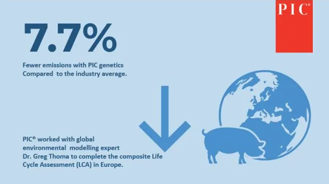 A new European Life Cycle Assessment confirms that a full program PIC pig (sire + dam) delivers a 7.7% reduction in greenhouse gas (GHG) emissions compared to the industry average.