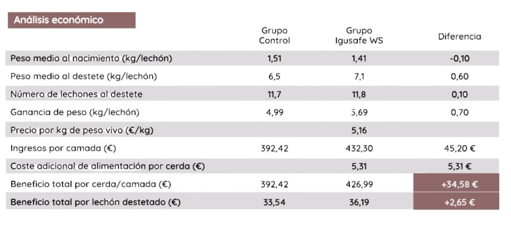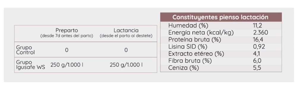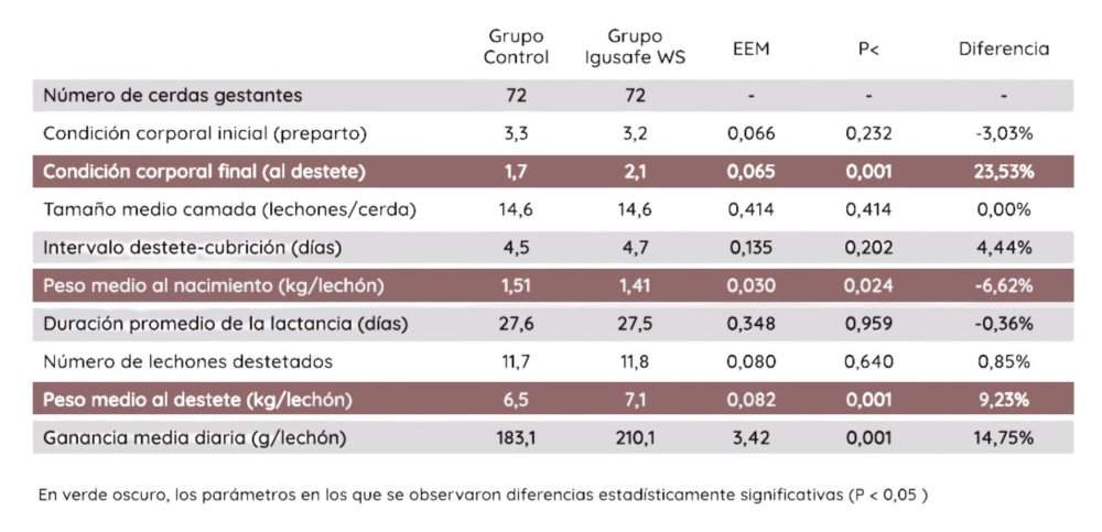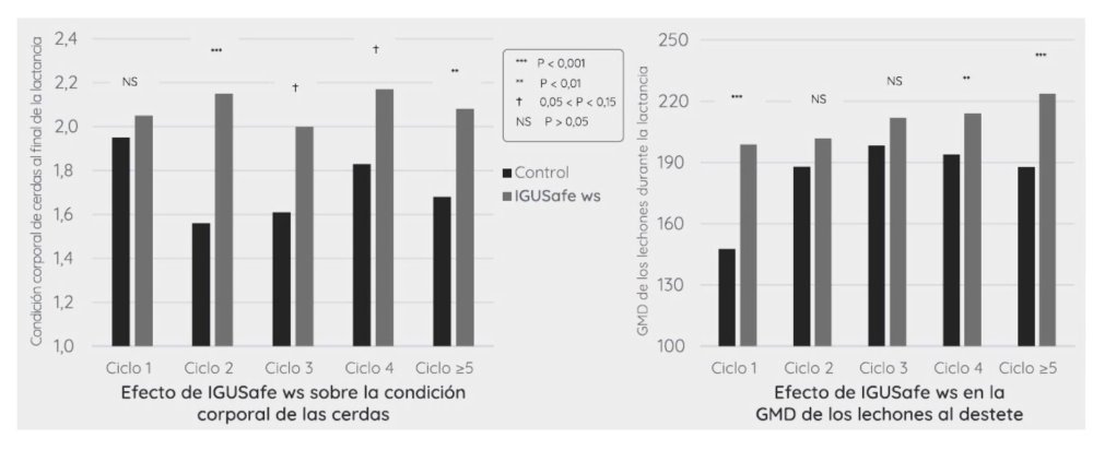 - Un mayor peso de la camada al destete en el grupo IGUSafe WS.