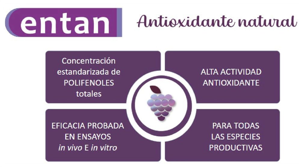 ENTAN se presenta como un suplemento basado en extractos de uva con una alta concentración de polifenoles antioxidantes, que pueden ofrecer beneficios adicionales sobre los antioxidantes tradicionales como la vitamina E. Su inclusión en la dieta animal puede sustituir y/o complementar los efectos antioxidantes de la vitamina E, proporcionando una protección más amplia contra el estrés oxidativo.