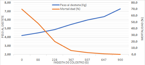 Figura 3. Efecto de la ingesta de calostro (corregido por peso al nacer) sobre el peso al destete y la mortalidad en la maternidad. Adaptado de Declerck et al (2016).