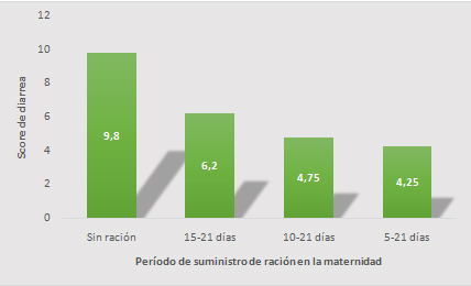 En la maternidad el lechón puede tener su primer contacto con dietas sólidas ya que es muy importante para la maduración del sistema digestivo. Es importante subrayar que la objetivo de la el suministro de alimento en maternidad es la preparación para el destete y no un aumento de peso significativo. En la figura 4, se demuestra una reducción significativa de la diarrea en los animales que reciben alimento en el pabellón de maternidad a la edad de 5 días. El efecto de esta práctica en el las dietas que facilitan el consumo, que tienen alta digestibilidad y apetecibilidad, son fundamentales para que esta práctica sea exitosa. Gradualmente se logra equilibrio de la el microbiota intestinal como resultado y así la obtención de mejoras en el rendimiento en etapas posteriores del crecimiento.