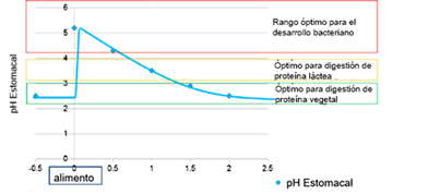 Figura 5. Alteración del pH del estómago promovido por la alteración de la alimentación durante el destete. Adaptado de Giesting et al (1991).
