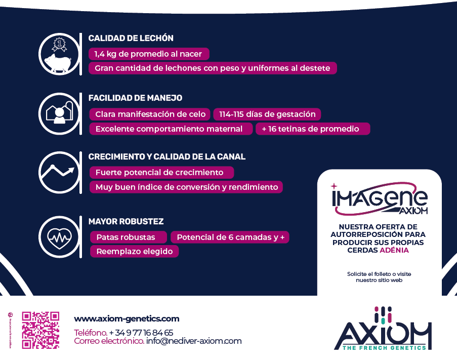 Fácil de manejar, las cualidades maternas de Adénia mejoran constantemente. Produce lechones numerosos, con peso y uniformes.
